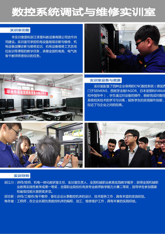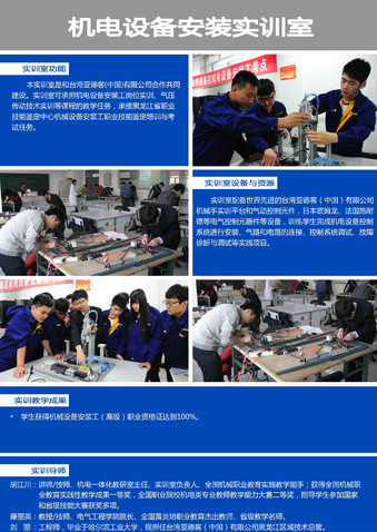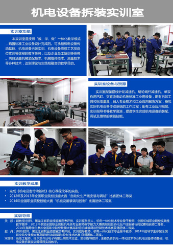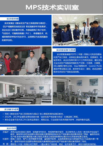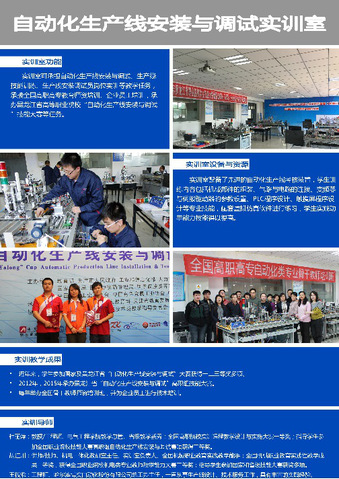 机电一体化技术专业现有供学生实践操作使用的实训室30个,其中涉及核心专业课程教学的实训室13个,其余实训室主要负责专业基础课程、创新能力培养及专业延伸课程等教学实践工作,现将核心实训室作如下介绍: